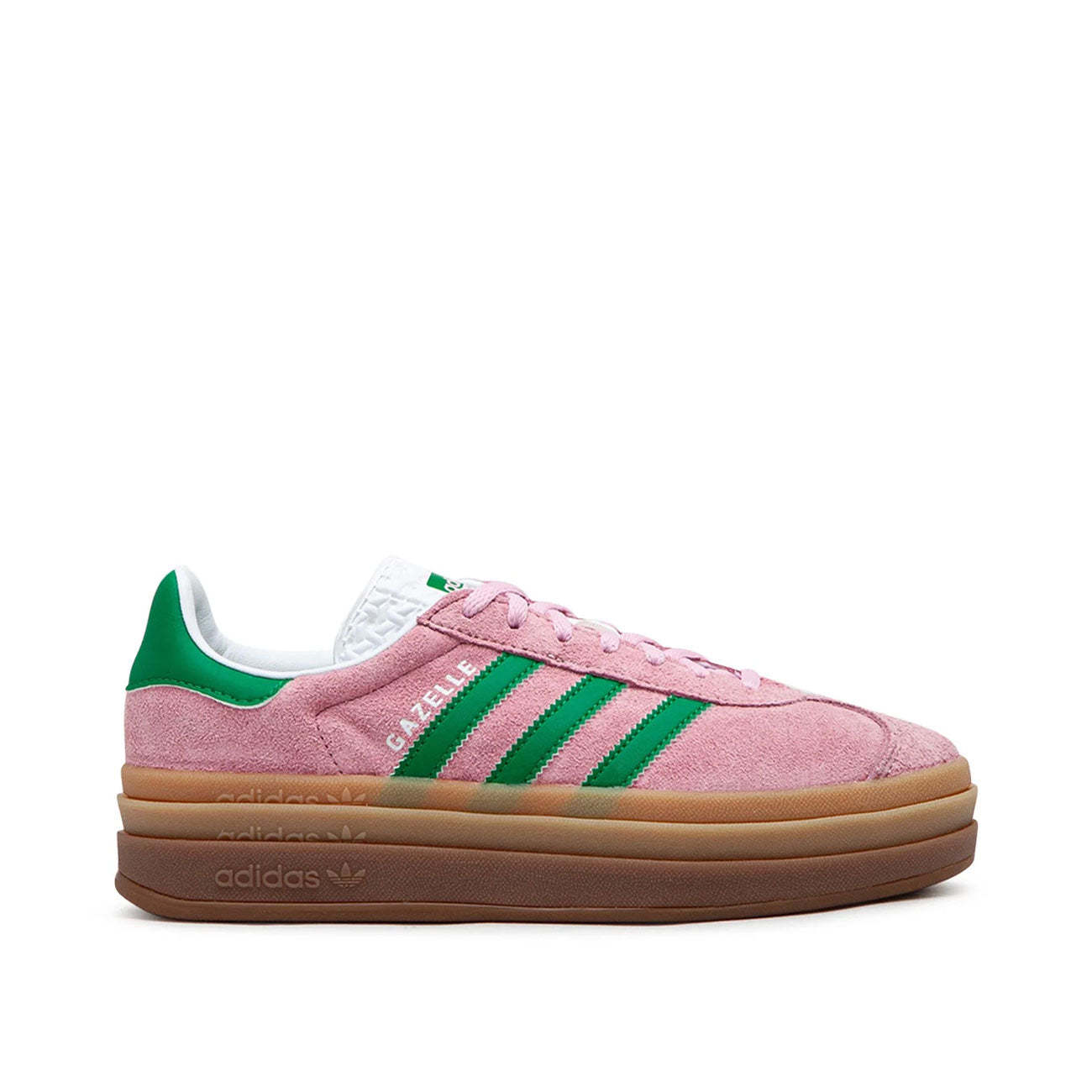 adithtdas klassischer Gazelle-Sneaker hat ein Update bekommen! Diese Damenversion hat ein rosafarbenes Upper mit leuchtend grünen Akzenten und extrahoher Gum-Plattformsohle.