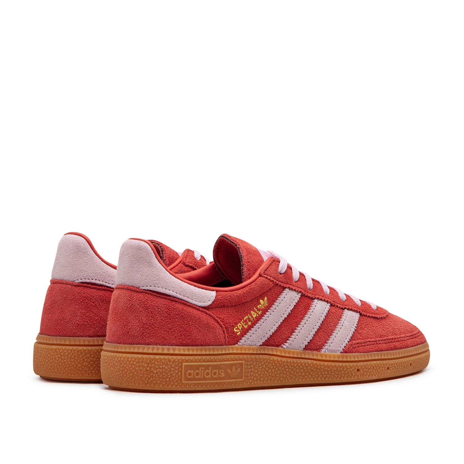 adithtdas Handball Spezial in einer Damenversion mit leuchtend rotem Wildlederupper und rosafarbenen Akzenten. OG-Style mit klassischen Elementen wie dem Obermaterial aus Wildleder und dem T-förmigen Overlay im Zehenbereich. Vintage-Vibes für jeden Tag.